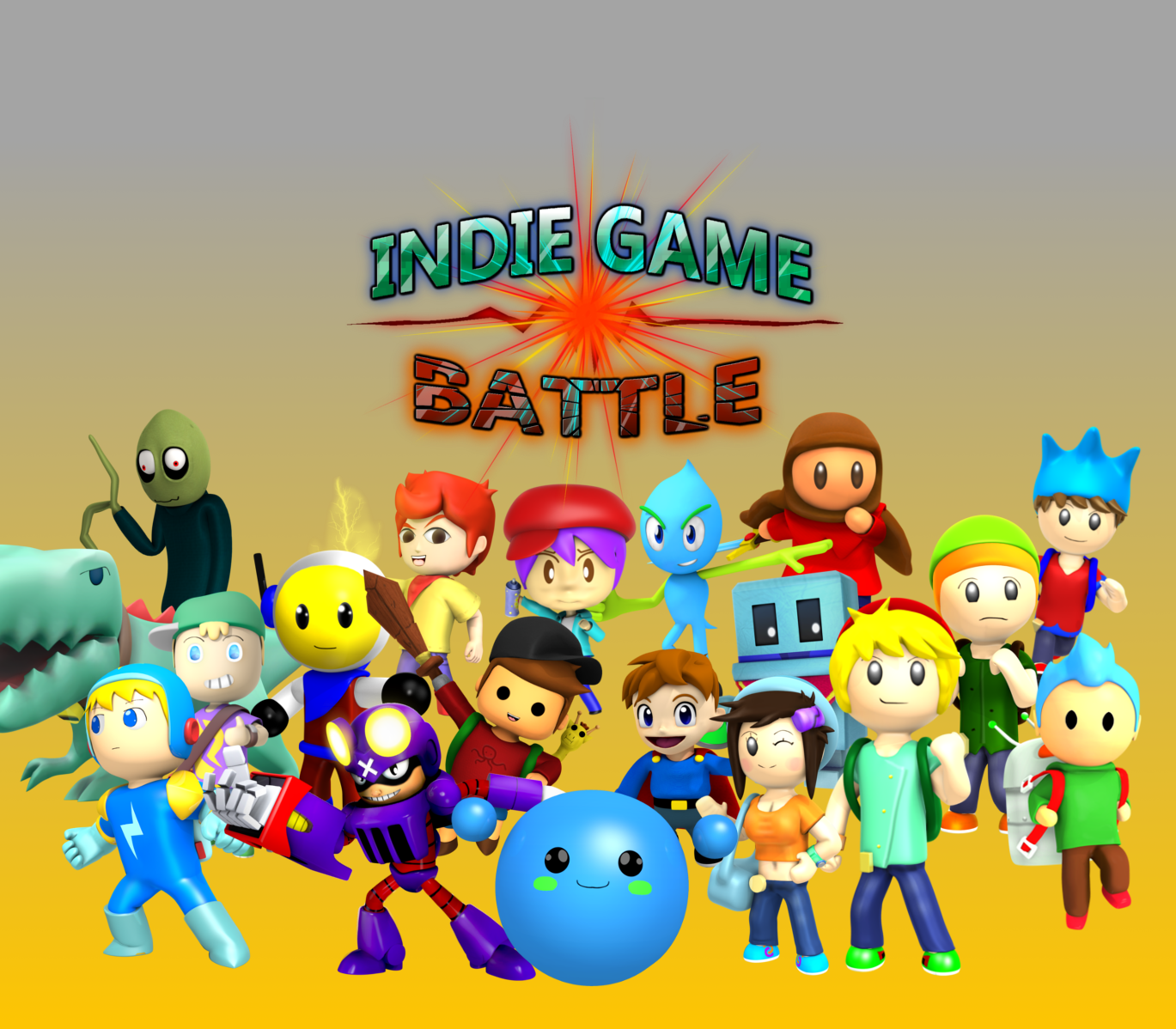 Indie Game Battle is a multiplayer fighting game for up to 8 players inspired by the Super Smash Bros series. However, IGB features indie characters instead, and the game is open for all suggestions! Indie Game Battle plays much like our very own version of Smash Bros. However, some core differences are the team-based gameplay, the status effect system, and the PP meter. IGB is intended to work especially well with team battle, which few other Smash Bros or Smash Bros-like games have put the same amount of focus upon. It works just as well with free for all and 1v1 matches, but some movesets and mechanics are designed to work in teams and create new strategies you may not see elsewhere. If you believe team battles aren’t popular enough in other games, IGB could be the game for you! The PP meter decides how much you can use certain moves on some characters, and the bar will refill over time. Maybe the move is especially powerful and therefore uses the PP bar to simulate a cooldown? Some characters depend on having PP left for using some of their moves. Using this wisely can win you the battle! The status effect system makes Indie Game Battle more based around strategy. Sometimes, only hitting your opponent enough isn’t the best strategy to beat them. Some characters can cause fire damage, poison opponents, drain them of the PP they need to use certain moves, slow down their movement speed, and more. Making your opponent disadvantaged and exploiting their weaknesses can turn a battle around! Features IGB features lots of playable characters from various indie games. Each character has their own unique moveset and special moves. Later on, we aim to have a roster of 60 characters or above, too! Over 10 stages to fight on. Each stage has a different design, different music, and different hazards. Various gamemodes. Right now the game only has one, but later we expect to add several more to keep the game fresh! Lots of settings! You can tweak settings to suit the way you prefer to play the game. Turn off healthbars or the damage percentage if you wish, toggle super attacks on/off, enable damage text, and more. You can even toggle things like stage hazards on/off, too! Competitive mechanics such as wavedashing, l-canceling, and more to discover! A story mode, featuring levels from the games involved! The story mode will come in a later part of development once we got the base game working best possible! Lots of third party indie games! IGB includes the games we at Blob Games Studio are developing ourselves, but lots other indies can join in, too!